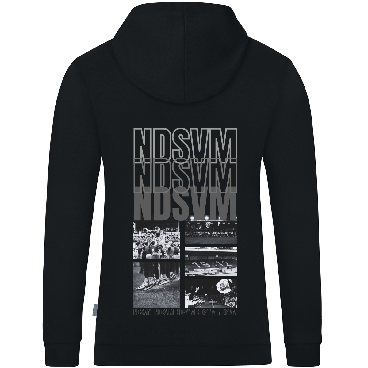 Dieser weiße Basic Hoodie im Unisex-Schnitt überzeugt mit mittigem Logo auf der Brust und dem markanten Rückenschriftzug „Seele der Stadt – Stolz der Region“.