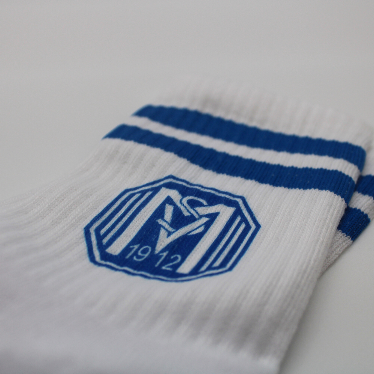 deine Vereinsliebe von Kopf bis Fuß. Unsere SV Meppen Socken überzeugen durch sportlichen Komfort und ein klares Bekenntnis zum Verein. Veredelt mit dem offiziellen SV Meppen Logo und zwei markanten blauen Streifen am Bündchen, passend zur Vereinsfarbe, sind sie das ideale Detail für dein Fan-Outfit – im Stadion, beim Training oder im Alltag. |