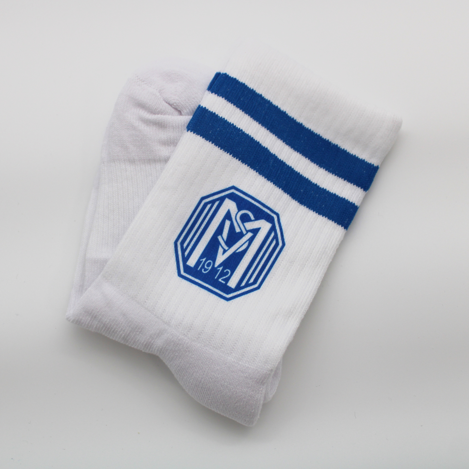 deine Vereinsliebe von Kopf bis Fuß. Unsere SV Meppen Socken überzeugen durch sportlichen Komfort und ein klares Bekenntnis zum Verein. Veredelt mit dem offiziellen SV Meppen Logo und zwei markanten blauen Streifen am Bündchen, passend zur Vereinsfarbe, sind sie das ideale Detail für dein Fan-Outfit – im Stadion, beim Training oder im Alltag. |
